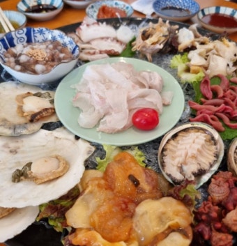 이곳의 모둠회는 광어, 우럭, 연어, 도미 등 다양한 활어가 포함돼 있고, 회 위에 광택이 돌 정도로 신선합니다. 기본 상차림도 아주 푸짐한데, 미역국, 매운탕, 멍게, 해산물 찜, 전복 버터구이까지 함께 나와 1인당 2만 원대 가격이 믿기지 않을 정도죠.