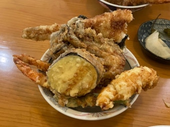 고쿠텐의 시그니처 메뉴는 단연 고쿠텐동입니다. 바삭하게 튀겨낸 새우, 오징어, 단호박, 가지, 꽈리고추, 김튀김 등 다양한 튀김이 밥 위에 푸짐하게 올라가고, 그 위에 특제 타래 소스를 살짝 뿌려 마무리합니다.