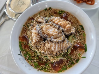 곰막 식당의 또 다른 인기 메뉴는 바로 회국수입니다. 탱글탱글한 면발 위에 신선한 회를 듬뿍 올리고, 달콤하면서도 새콤한 양념장을 비벼 먹는 이 메뉴는 입안 가득 제주 바다의 신선함을 전해줍니다. 회와 양념장이 조화를 이루면서 느끼하지 않고 깔끔한 뒷맛을 남기기 때문에, 더운 여름철에는 특히 인기 있는 메뉴입니다. 많은 관광객이 곰막 식당을 방문하면 반드시 주문하는 메뉴로 꼽히며, 회국수를 먹고 나면 “제주에 왔다”는 실감이 날 정도로 현지 감성이 물씬 풍깁니다.