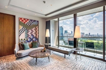 객실 내부는 바닥에서 천장까지 이어진 대형 통유리창을 통해 방콕 시티뷰 또는 룸피니 공원뷰를 감상할 수 있다. 낮에는 햇살이 가득 들어와 따뜻하고 밝은 분위기를 주며, 밤에는 방콕의 야경이 한눈에 펼쳐져 로맨틱한 분위기를 자아낸다.