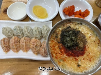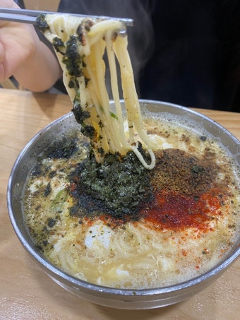 하얀 국물에 부드러운 면발, 고명으로 얹힌 김가루와 들깨가루가 특징이에요.
