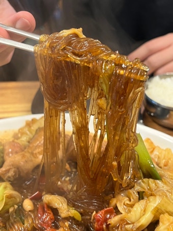 거기에 국물과 잘 어울리는 쫄깃한 당면이 빠질 수 없죠. 보통 찜닭집에서 쓰는 당면은 일반 당면이 아니라 감자 전분으로 만든 넓은 당면을 사용해요. 이 당면은 국물을 오래 머금어도 퍼지지 않고 탱탱한 식감을 유지하죠. 그래서 양념과 당면, 그리고 닭고기까지 하나로 퍼펙트한 맛의 하모니를 만들어냅니다.