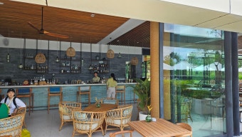 건물은 개방감 있게 설계되어 시원한 바닷바람이 그대로 통하고, 실내와 실외 공간이 자연스럽게 연결되어 있어 답답함이 전혀 없습니다. 곳곳에 배치된 라탄 의자, 쿠션이 깔린 소파, 낮은 테이블 등이 자유롭고 편안한 분위기를 만들어줍니다.