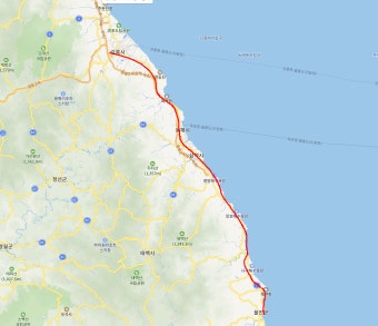 북쪽 끝은 강원도 고성군의 통일전망대입니다. 여기서는 남북 분단의 현실을 느낄 수 있으며, 맑은 날이면 북녘 땅이 보이기도 합니다. 속초, 양양, 강릉, 동해, 삼척 등 강원도의 주요 해안 도시를 지나며 각 지역마다 특색 있는 풍경과 문화를 체험할 수 있습니다.