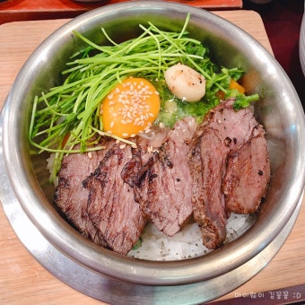 김이 모락모락 나는 밥 위에 버터, 해산물, 고기 토핑이 고급스럽게 올려져 있어 사진 욕구를 자극합니다.