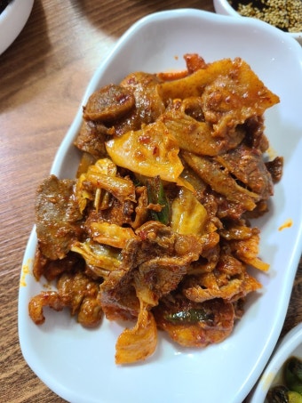 백반 외에도 추가로 시킬 수 있는 **제육볶음(3,000원)**이 인기입니다. 흔히 고깃집이나 분식집에서 제육볶음을 시키면 가격이 만 원은 훌쩍 넘지만, 이곳에서는 부담 없이 곁들일 수 있습니다. 양도 넉넉해 둘이서 나눠 먹기에도 좋고, 매콤달콤한 양념이 밥과 잘 어울려 단골손님들이 꼭 추가하는 메뉴이기도 합니다.