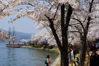호수를 따라 흐드러지게 피는 벚꽃은 마치 분홍빛 파도 같아요.