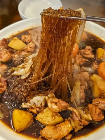 찜닭은 단지 닭고기만의 요리가 아닙니다. 큼직하게 썰어 넣은 감자, 당근, 대파, 그리고 쫄깃한 당면이 함께 들어가는데요. 이 모든 재료들이 간장 양념에 푹 익으면서 각각의 풍미를 극대화시키죠. 감자는 부드럽고, 당근은 은근히 달콤하며, 대파는 개운한 맛을 더해줍니다. 무엇보다 당면이 양념을 흡수해 푹 쫄깃해질 때, 그 한입은 절대 거부할 수 없어요.